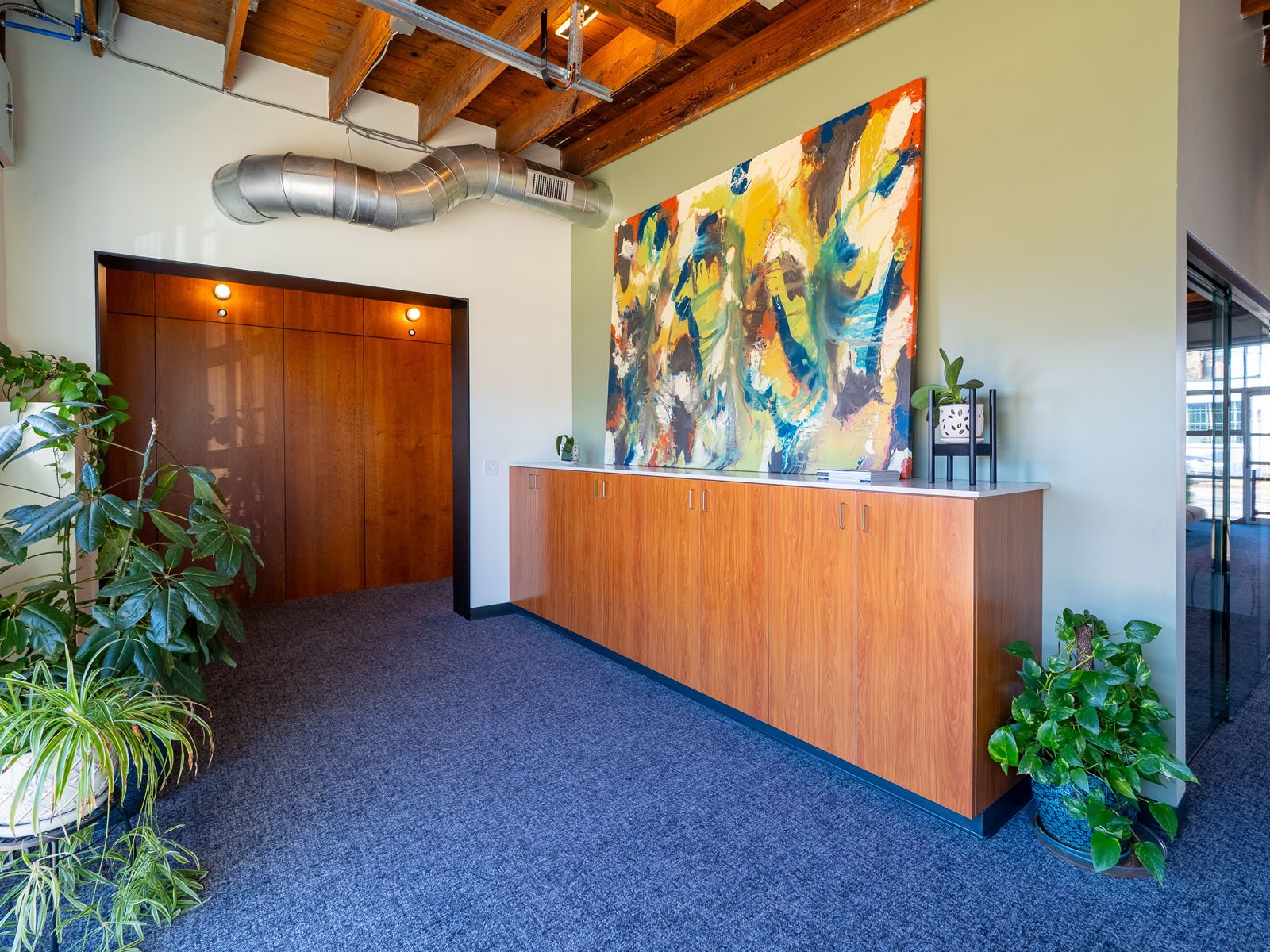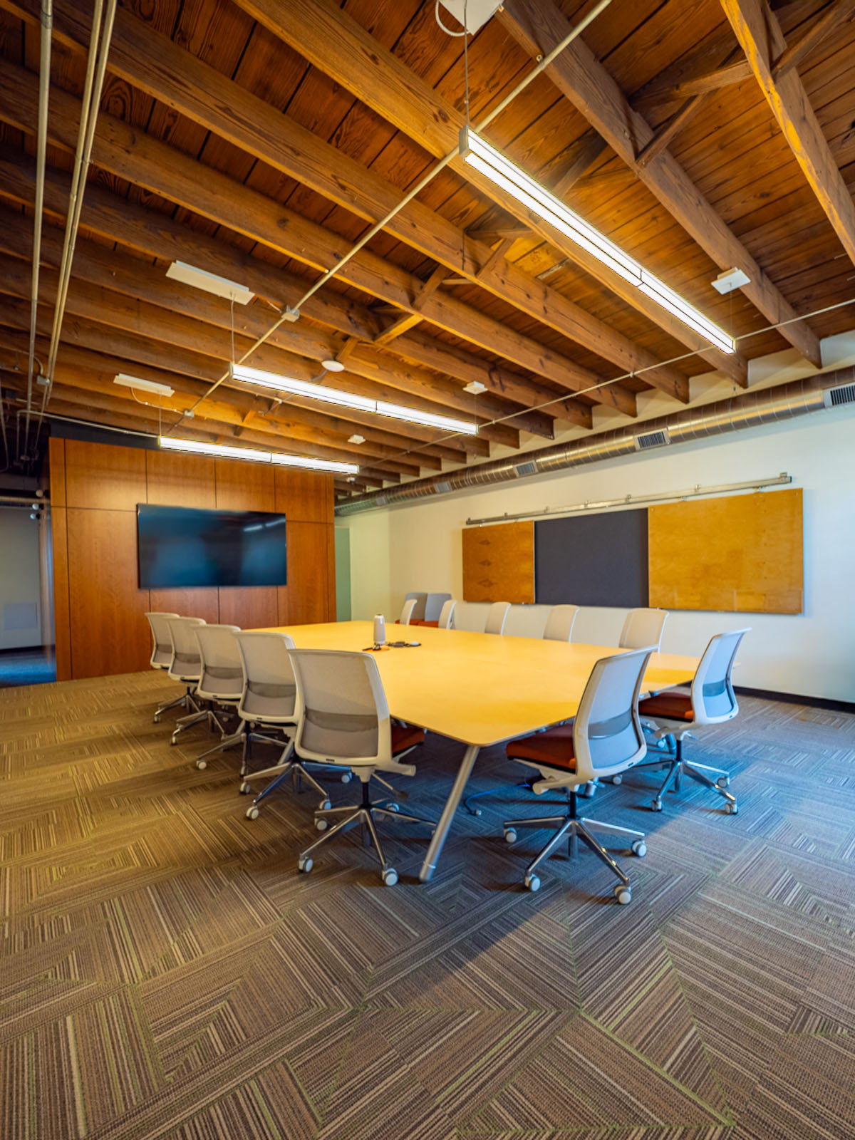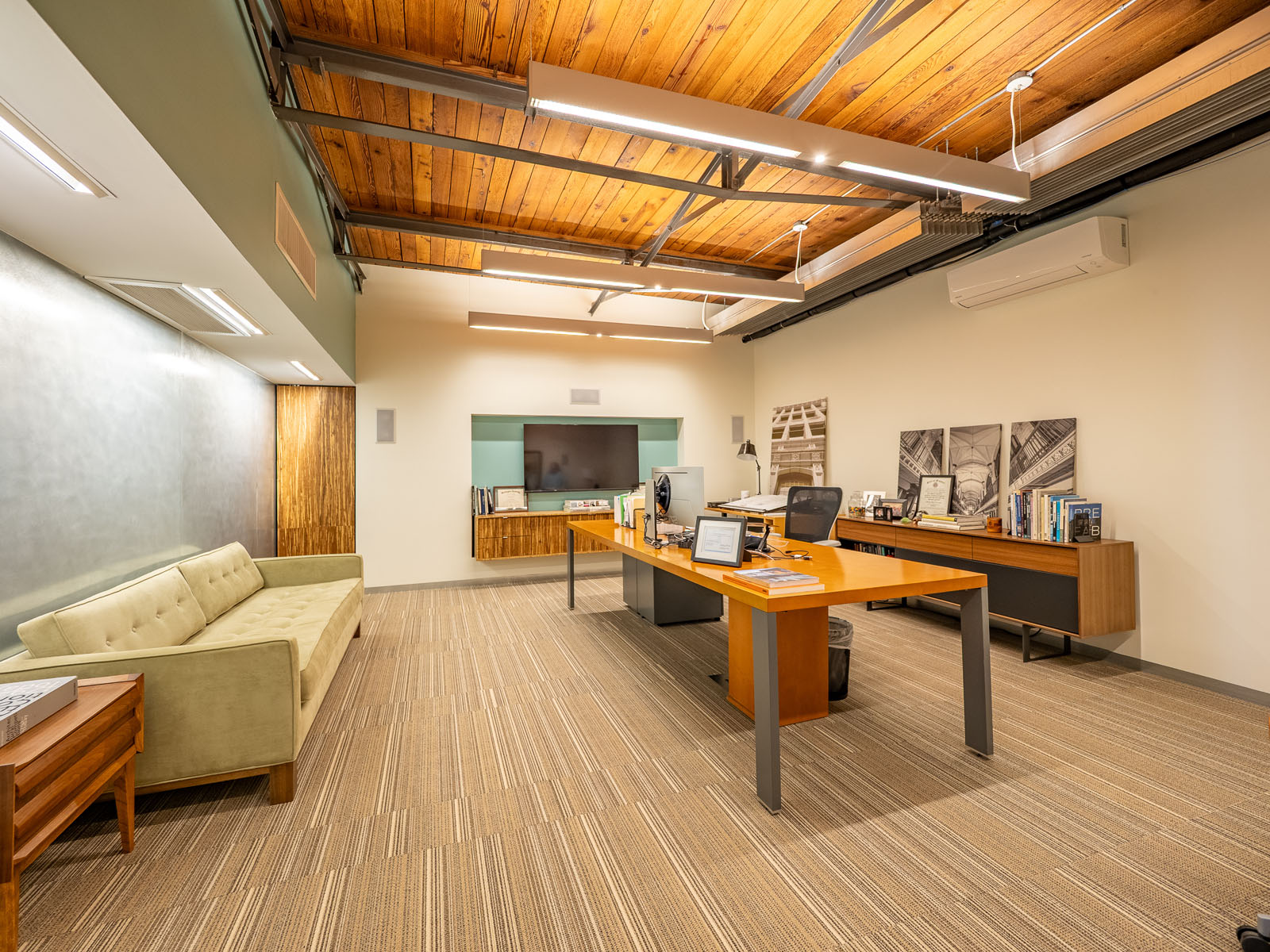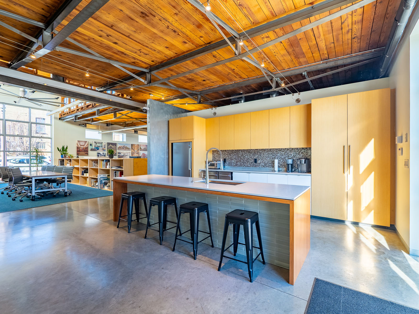 Formerly the office of another architecture firm, the building was purchased and renovated to fit the needs of E+A’s new office which included adjustments to the open studio space layout with refreshed finishes, improvements to the design of the kitchen, and the transformation of the previous fabrication shop in the back portion of the building to provide private offices, individual “Zoom” rooms, and a large conference room.